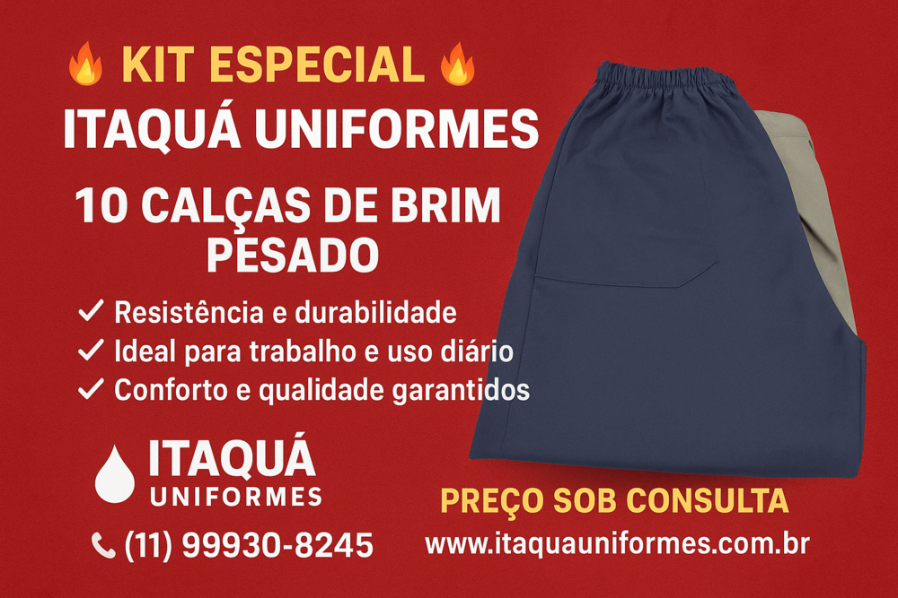 As calças em brim são conhecidas pela durabilidade e conforto. Podem ser confeccionadas com bolso faca, bolso lateral, reforço nos joelhos e outras opções conforme a função do trabalhador. Ideais para equipes operacionais e serviços técnicos.